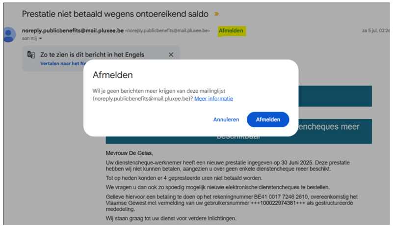 Sommige diensten, zoals Gmail, Outlook en Yahoo, tonen bovenaan het e-mailbericht een knop ‘Afmelden’. Wanneer u op deze knop klikt, wordt uw adres automatisch uitgeschreven van onze verzendingen, zonder gebruik te maken van onze eigen afmeldlink.